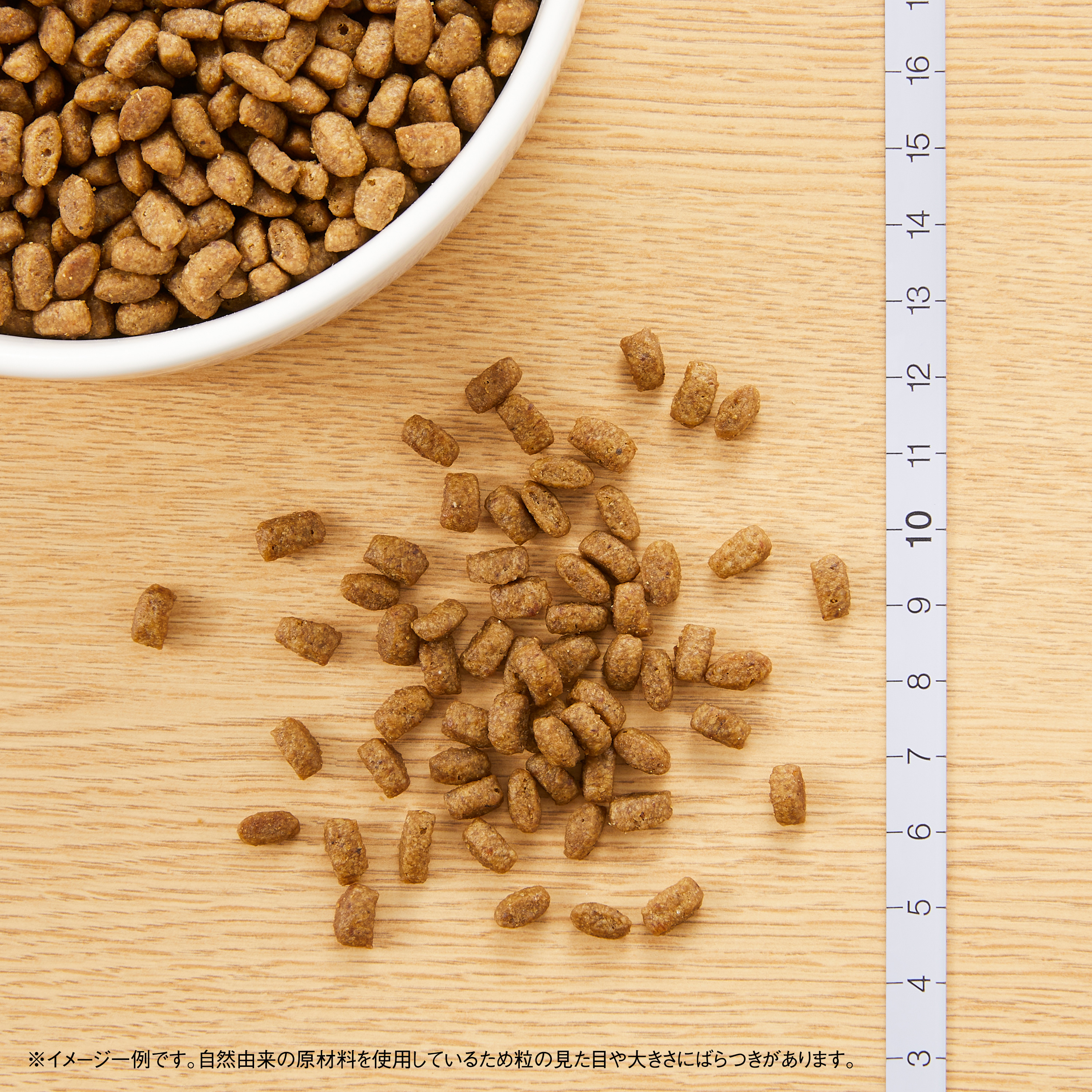 チキン(肉)、チキンミール、エンドウタンパク、鶏脂*1*2、粗挽き米、玄米*3、ポテトタンパク、ビートパルプ、オートミール*3、サーモンミール、タンパク加水分解物、アルファルファミール、大豆油*1、フィッシュオイル*1*4、ユッカ抽出物、ビタミン類(A、B1、B2、B6、B12、C、D3、E、コリン、ナイアシン、パントテン酸、ビオチン、葉酸)、ミネラル類(カリウム、クロライド、セレン、ナトリウム、マンガン、ヨウ素、亜鉛、鉄、銅)、アミノ酸類(タウリン、メチオニン)、酸化防止剤(ミックストコフェロール、ローズマリー抽出物、クエン酸)*1 ミックストコフェロールで保存*2 ω6脂肪酸含、*3 食物繊維含、*4 DHA、ω3脂肪酸含