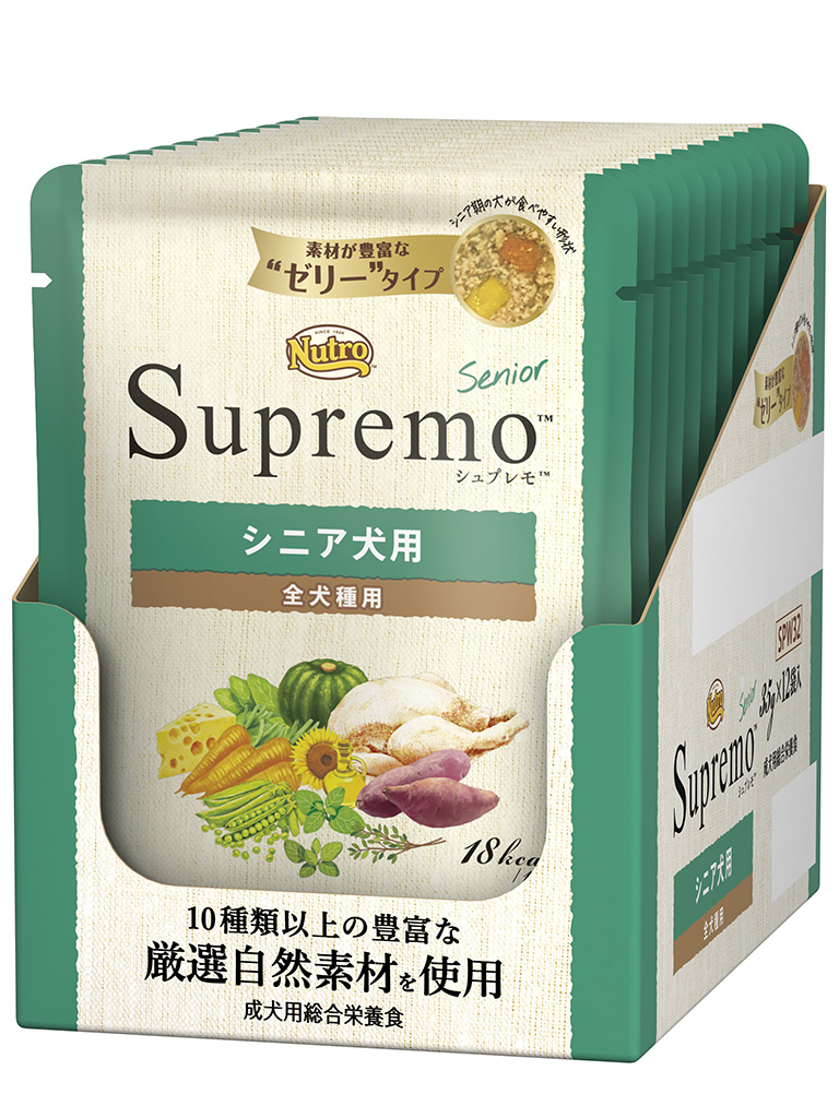 10種類以上の豊富な自然素材の栄養とおいしさを引き出すようにブレンドしたナチュラルウェットフード。使い切りにちょうどよいミニパウチ。健康で活き活きとしたシニア期を維持するために、抗酸化成分を配合。シニア期の消化のしやすさに配慮し、皮膚・被毛の健康を維持。
