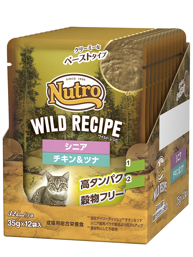 肉食の猫が本能で求める抜群のおいしさと、高タンパク・穀物フリーを実現したウェットフード。食が細くなってきた愛猫のために、食べやすいクリーミーなペーストタイプ。シニア猫の衰えがちな消化吸収に配慮し、カロリーと脂質を成猫用製品より高めに設定。