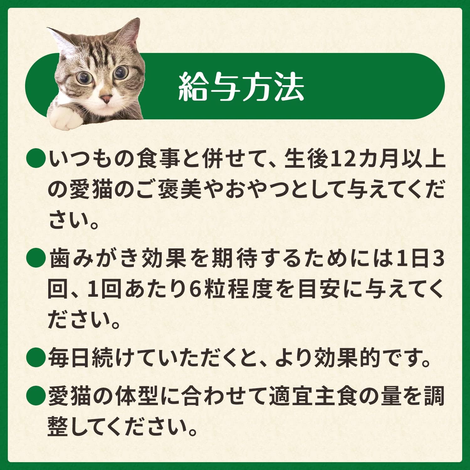 主原料は自然素材で、おいしく噛んで歯垢をキレイに落とす歯磨き専用スナック。グリルチキン・西洋マタタビ風味。