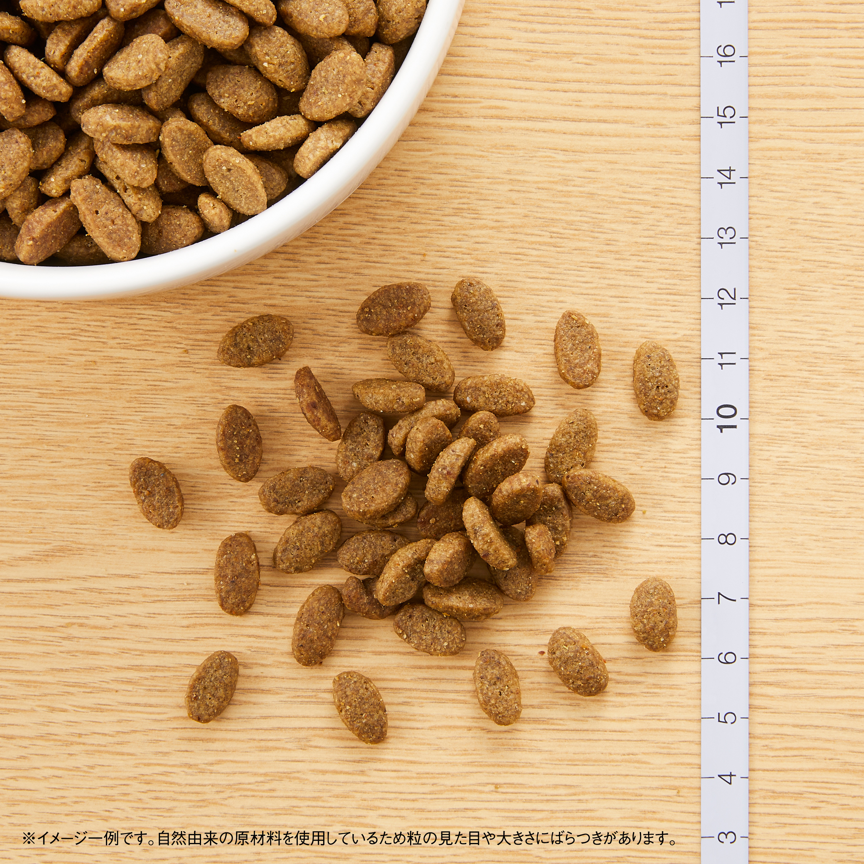 ターキー(肉)*2、チキンミール、粗挽き米、エンドウタンパク、玄米*3、鶏脂*1*4、オートミール*3、ポテトタンパク、ビートパルプ、アルファルファミール、大豆油*1、亜麻仁*5、タンパク加水分解物、ユッカ抽出物、ビタミン類(A、B1、B2、B6、B12、C、D3、E、コリン、ナイアシン、パントテン酸、ビオチン、葉酸)、ミネラル類(カリウム、クロライド、セレン、ナトリウム、マンガン、ヨウ素、亜鉛、鉄、銅)、アミノ酸類(タウリン、メチオニン)、酸化防止剤(ミックストコフェロール、ローズマリー抽出物、クエン酸)*1 ミックストコフェロールで保存*2 鉄分、ビタミンB2含、*3 食物繊維含、*4 ω6脂肪酸含、*5 ω3脂肪酸含
