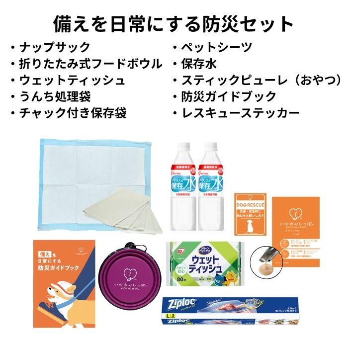 いのちのしっぽは、日常から「もしも」を考えるきっかけになる防災セットです。防災は特別なものではなく、日常の延長線にある存在として感じてもらえるような一時避難想定した簡易セットです。大きめに作られたナップサックには、普段食べているごはんや必要なものを入れることができます。また、QRコードより動物避難所掲載の「うちトコ動物避難マップ」がご覧になれます。日常から緊急時までいつでも確認することができます。指定避難所のペット同伴避難の受け入れ状況については、お住いの自治体にご確認ください。防災ガイドブックにはうちの子の情報を記入ができます。家族の決めごとをメモすることもでき、「もしも」を話し合うきっかけになればと思います。おうちに残ったうちの子の存在を知らせるためのレスキューステッカーは、災害や緊急時などの際に救助を促すことができます。他にも水やトイレなど避難時に必要なアイテムも入っております。