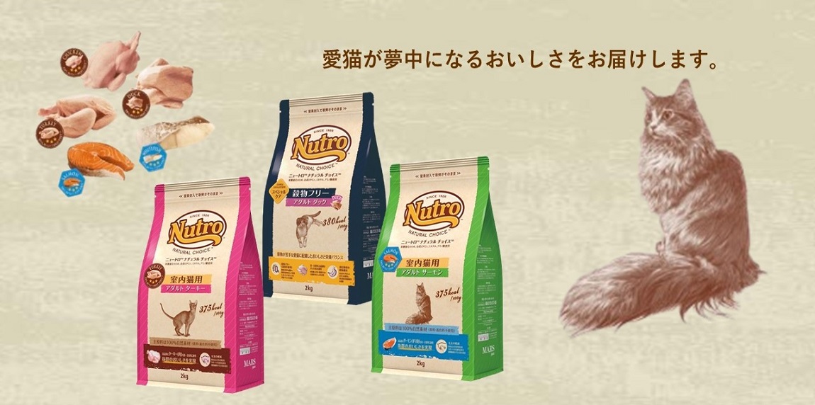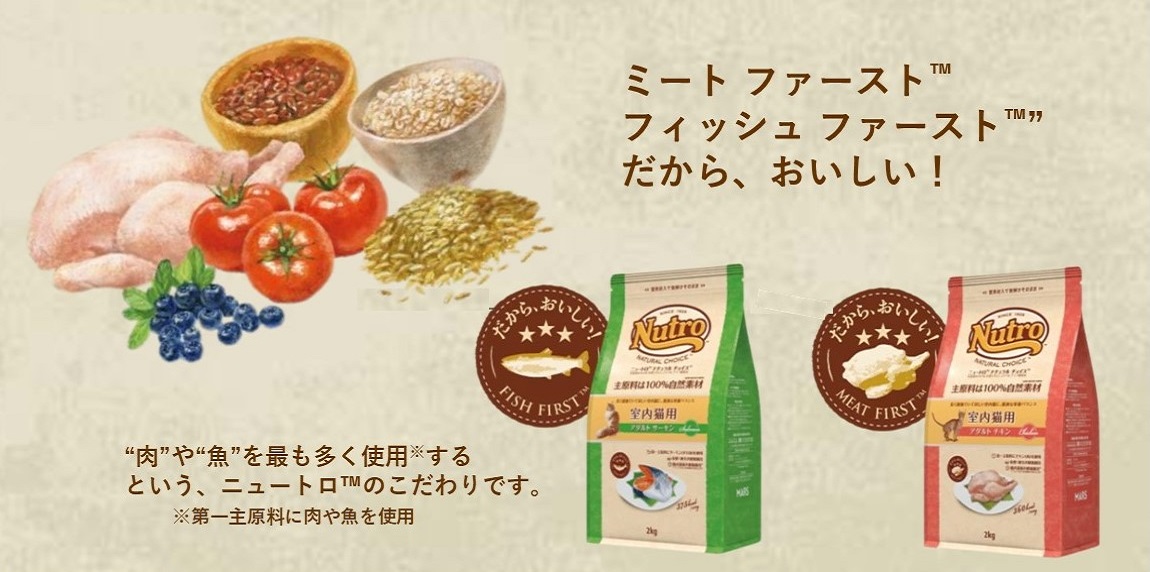 また、高品質なチキン・フィッシュなどの“肉”や“魚”を第一主原料に使用し、ニュートロ™の高い製造技術により、素材本来のおいしさをそのまま封じ込め、抜群のおいしさを実現。。